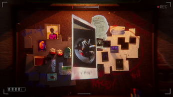 After having turned the traces into proofs, the player then has to figure out whether that trace was left by the focus entity or one of the others by dragging them on the pinboard wall and taking a closer look with [RT]. It helps reading the articles shown at the beginning and being observant about the aestethic patterns in which the traces occur.